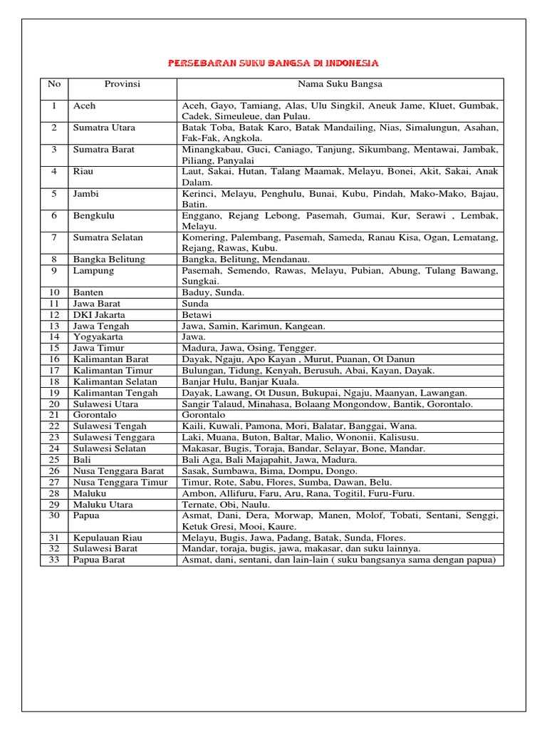 Peta persebaran suku bangsa 34 propinsi di indonesia beserta daerah asalnya indonesia memiliki wilayah daratan dan kepulauan yang sangat luas. Tari topeng nama propinsi di nusa tenggaran dan bali indonesia. Bangunan khas suatu daerah dinamakan. Tari daerah dapat berfunsgi sebagai alat penyambutan tamu, adat istiadat, hiburan, dan sebagianya. Ada ratusan suku bangsa di indonesia. Suku jawa memang hidup di pulau jawa, sesuai dengan nama suku bangsanya. Selain suku atau etnis yang disebutkan diatas, masih. Rumah adat nama rumah adat di indonesia 1. Provinsi suku bangsa 1 nanggroe aceh darussalam misalnya, suku asmat yang tinggal di irian barat. Sunda, bahasa cirebonan, bahasa cirebon dialek indramayu, bahasa melayu dialek betawi, bahasa betawi. Oleh karena itu, wajib dilestarikan pakaian adat jawa tengah pakaian adat sumatra barat. Suku lubu, daerah perbatasan antara provinsi sumatera utara dan provinsi sumatera barat. Suku aneuk jamee di kabupaten aceh selatan, kabupaten aceh barat daya.